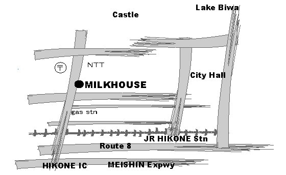 | From the Hikone Exit off the Meishin Expressway, follow the signs straight into Hikone. After crossing the bridge above the railroad tracks, you will pass a gas station to your right and then reach the Kyomachi intersection. Milk House is the 4th building on the right. (approximately 4 minutes from the Hikone exit) |